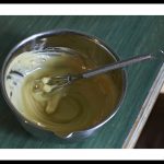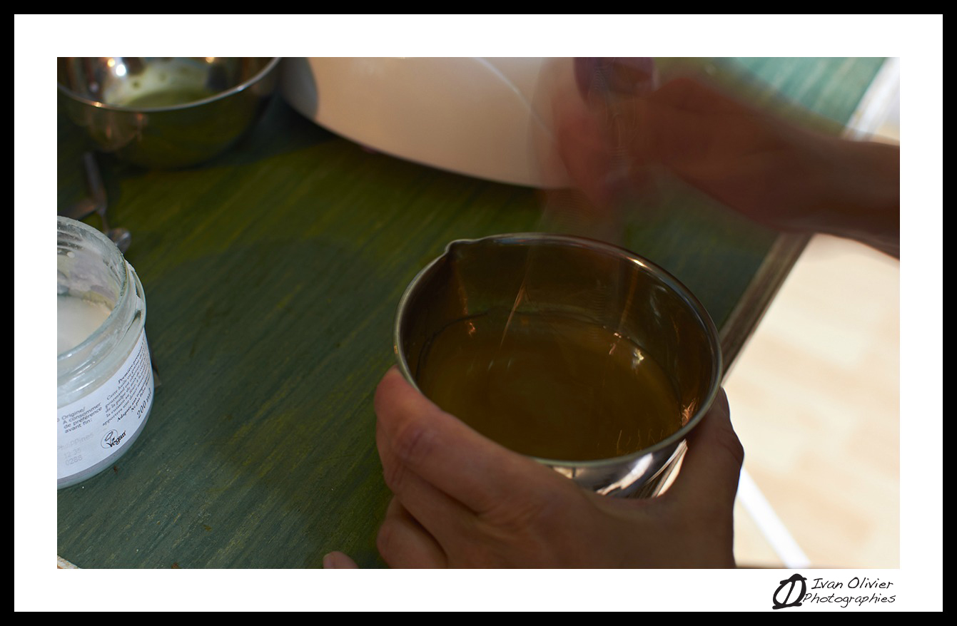 5° Peser le miel, l’HE de lavande, puis les ajouter petit à petit à l’émulsion, en mélangeant bien.