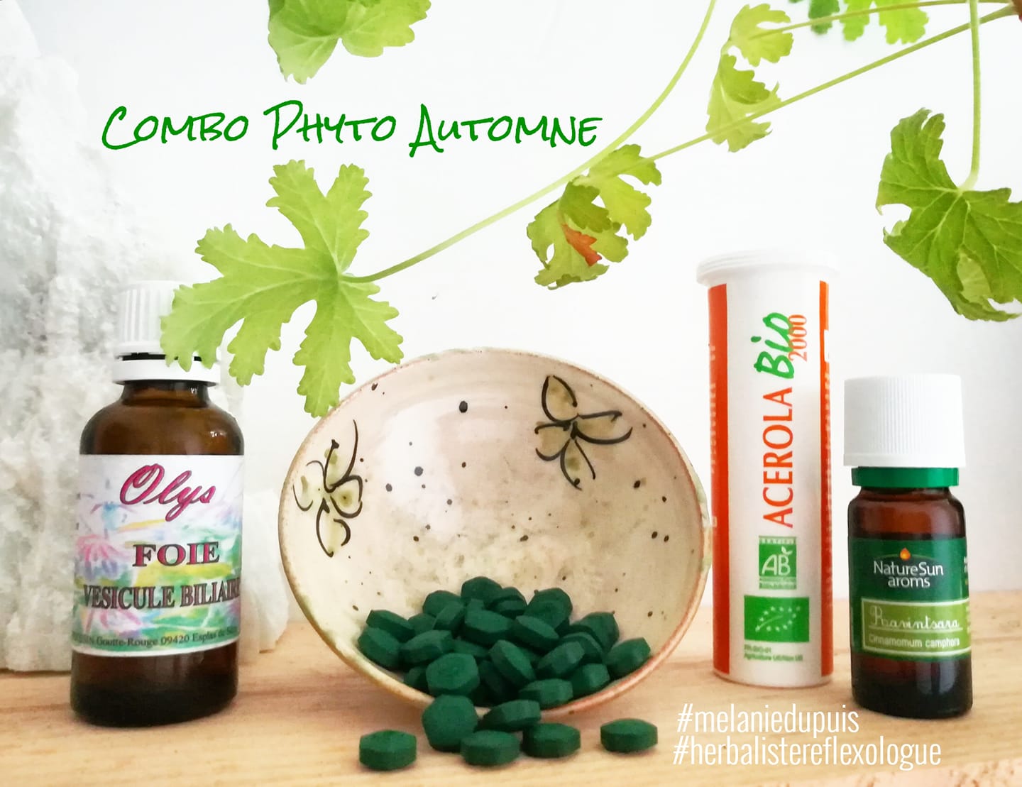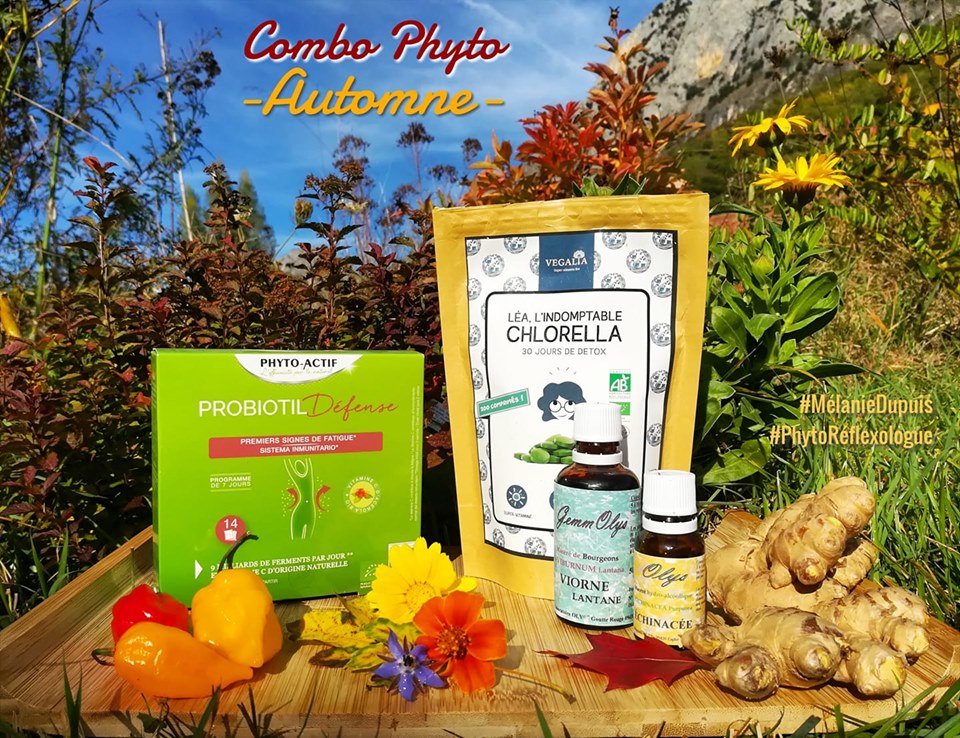 COMBO PHYTO AUTOMNE:🍂 Après l’été indien, l’automne a l’air de vouloir s’installer par ici… ✨ Pour accompagner au mieux votre organisme en phyto-minéralogie pendant cette saison, voici ce que je vous propose: 🌿 De la teinture d’échinacée pour stimuler votre immunité 🌿 En MTC, nous sommes à l’heure du Poumon/Gros intestin et pour les renforcer je vous conseille du bourgeon de viorne lantane et des probiotiques. 🌿 C’est le bon moment aussi pour faire une petite cure «detox» et de vitamines avec la chlorelle. 🌿 Et enfin, un bon stimulant, réchauffant et ayant un tropisme avec le gros intestin, je vous propose d’ajouter du gingembre à vos infusions quotidiennes. 🔥