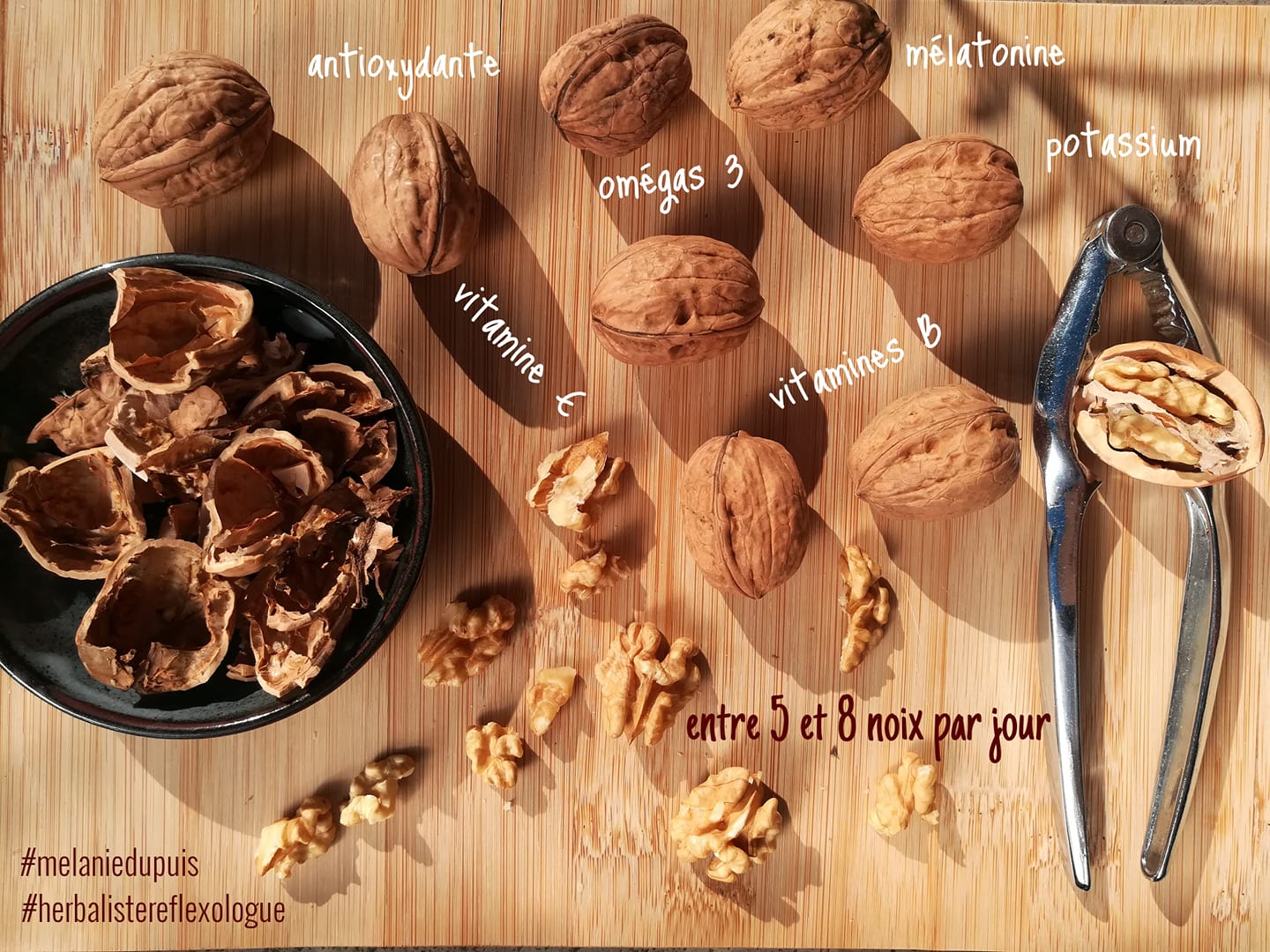 COMBO PHYTO NOIX: Elles ont la forme du cerveau et ce mimétisme très utilisé par nos anciens n’y est pas pour rien! ✅ Très antioxydantes ✅ Riches en omégas 3 ✅ en mélatonine ✅ en potassium ✅ et en vitamines B ✅ elles sont aussi une source de fibres et de nombreux nutriments. 😋Les noix sont donc délicieuses en goût mais elles sont aussi bonnes pour la santé de notre système vasculaire, apportent une satiété en cas de grignotage et apportent certains minéraux et oligo-éléments en bonne quantité.✨ Pensez aussi à elles en collation, vers 17h pour leur teneur en mélatonine pour un meilleur sommeil. 💤 💪 Et elles ne vous feront pas grossir si vous en mangez entre 5 et 8 par jour! Des études montrent même le contraire… 😉