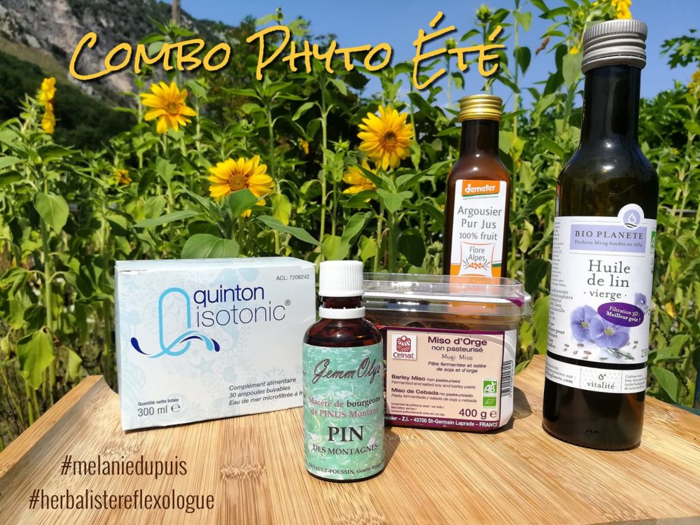 COMBO PHYTO ETE: 🌞 Il n’est pas trop tard pour vous donner mes quelques conseils en phyto-minéralogie pour cette période estivale! Surtout après cette période caniculaire! 😎Voici ce que je vous propose: 🌿 De la silice liquide ou du pin en gemmotherapie pour aider vos ligaments, tendons et articulations. 🌿 Des omegas 3 (huile de lin, chanvre, noix, cameline – poissons gras – compléments) pour reconstituer le stock avant la rentrée. 🌿 De la vitamine C (jus d’argousier par exemple) dont notre organisme a bien besoin pendant les fortes chaleurs d’autant plus si vous vous sentez fatigués. 🌿 Du plasma de quinton marin pour refaire le plein de minéraux qui s’échappent notamment avec la sueur. 🌿 Du miso pour l’effet probiotique et pour après l’effort..